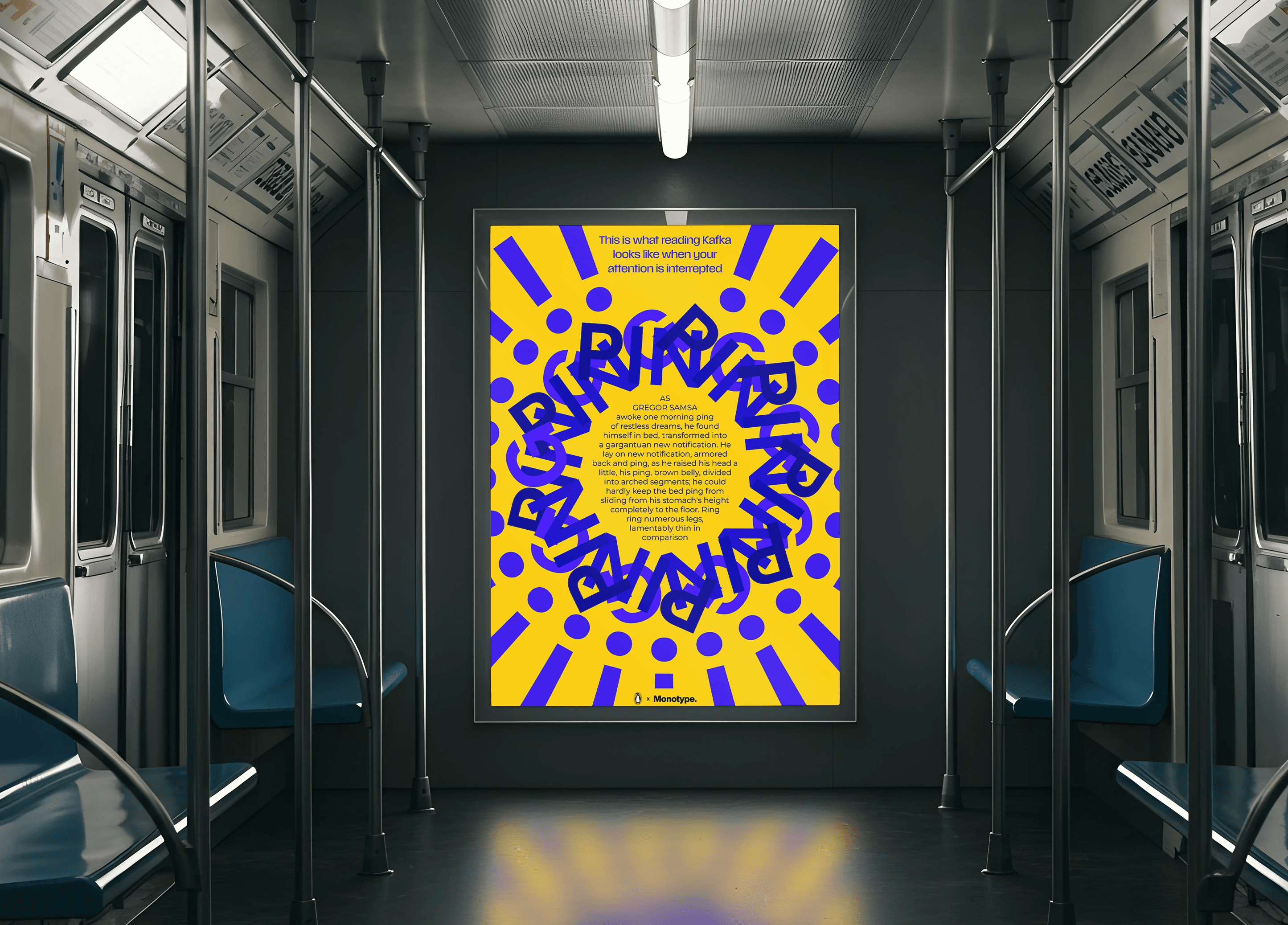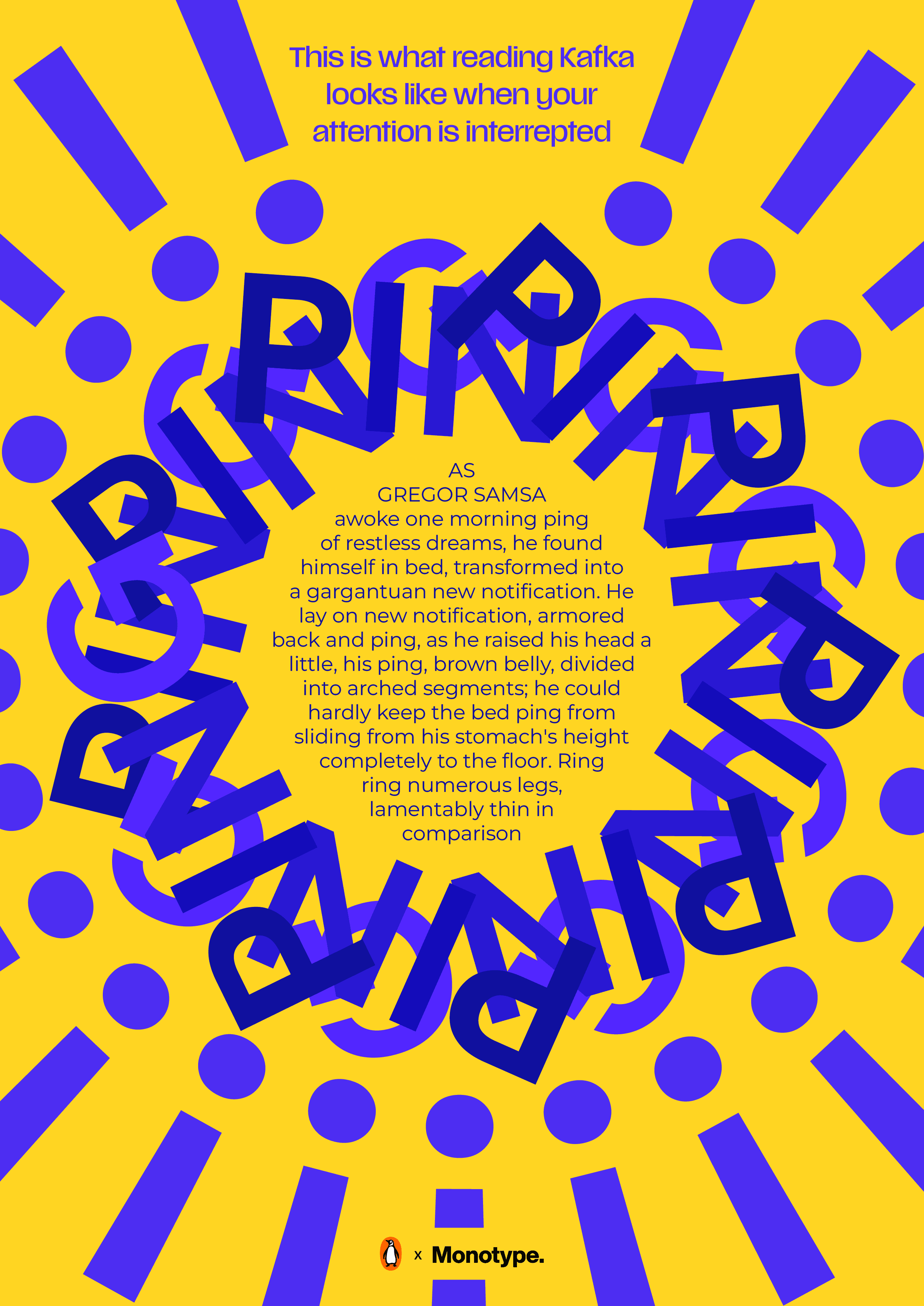 This poster series explores how attention span affects reading comprehension. Using lines from well known literary classics, each poster shows how text begins to break down and turn into visual noise when attention slips. Each piece highlights a different distraction, with the line “This is what reading [author] looks like when [attention is disrupted].